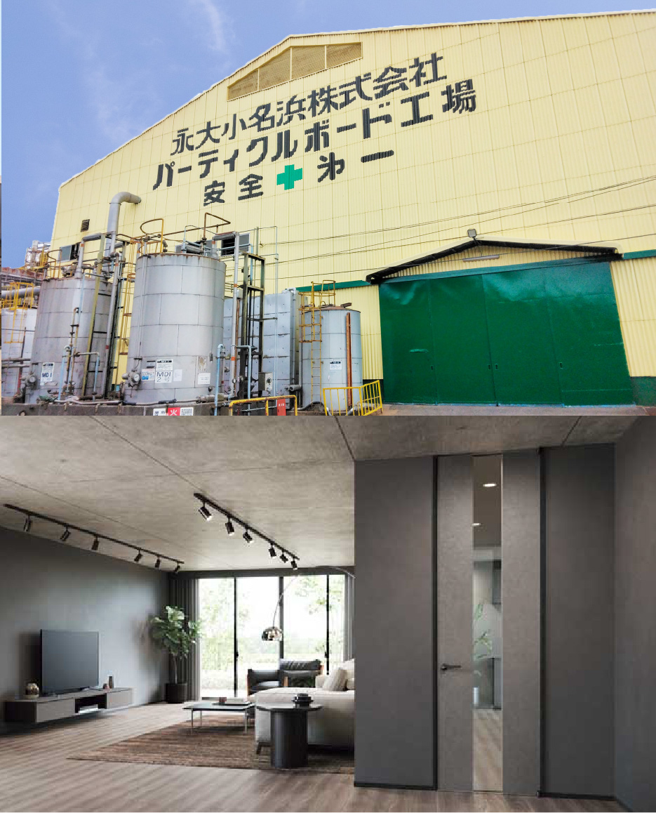 パーティクルボードは建物の解体で発生する木質廃棄物や間伐材等を主原料として熱圧成形された木質素材であり、限られた地球資源を有効活用できる循環型リサイクル素材です。 キッチン、洗面化粧台、内装家具、シューズボックス、床下地材等、我々の身近なところで多く使用されております。